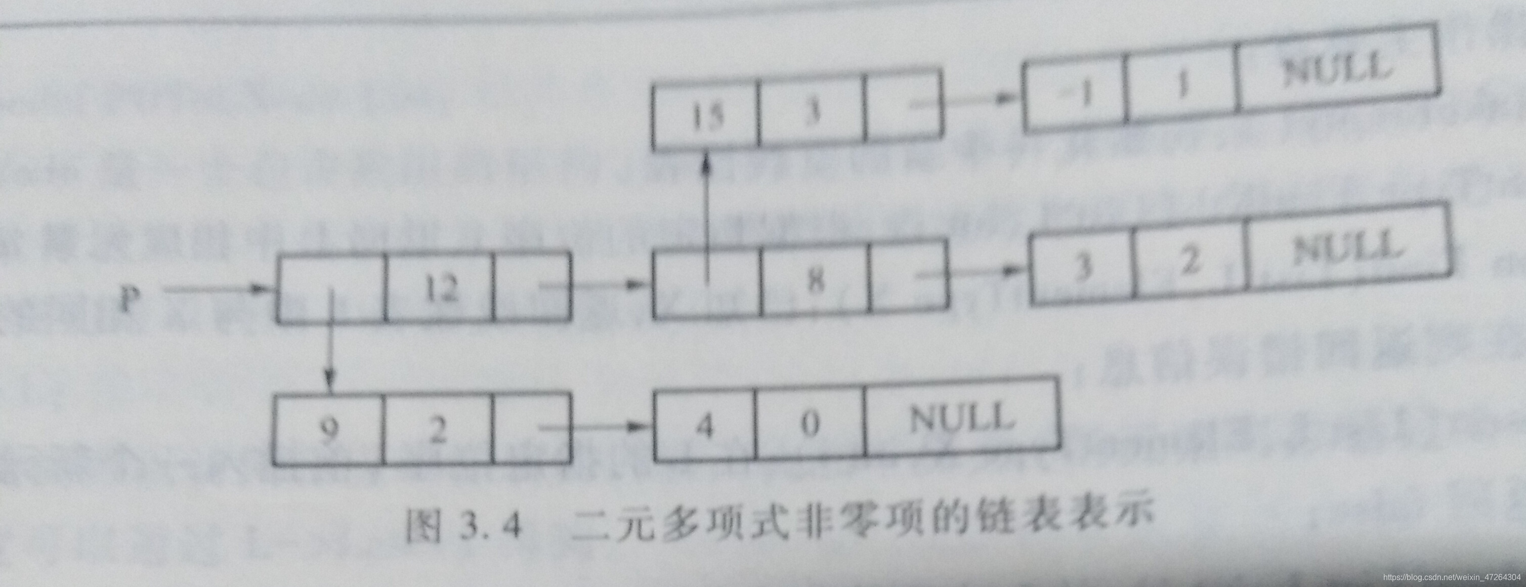 用链表表示多项式,每个链表的结点存储多项式的一个非零项,包括系数和指数两个数据域以及一个指针域,其结点结构可表示为:
